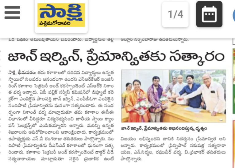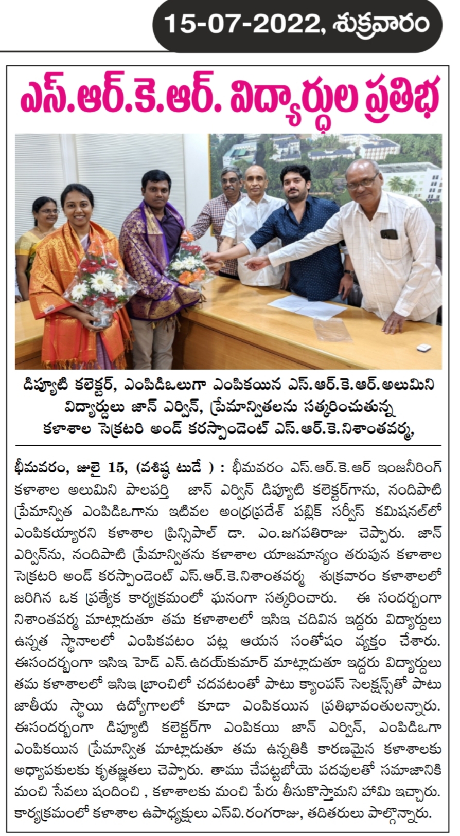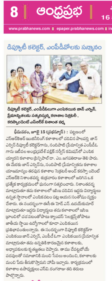 The alumni of SRKR ECE Dept Mr. John Erwin and Ms. Premanvita had selected in APPSC Exams as Deputy Collector and MPDO respectively. They were felicitated in the college by Secretary Cum Correspondent of SRKR Sri. SRK Nishanth Varma and he expressed his happiness for their achievement and wished them all the best in their future endeavours. Principal of SRKR, Dr. M. Jagapathi Raju, Vice President of SRKR Sri. SV Ranga Raju, ECE HOD Dr. Uday Kumar participated in this occasion.
