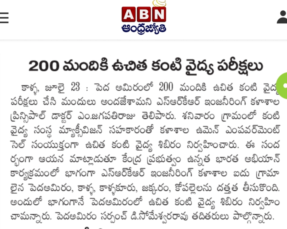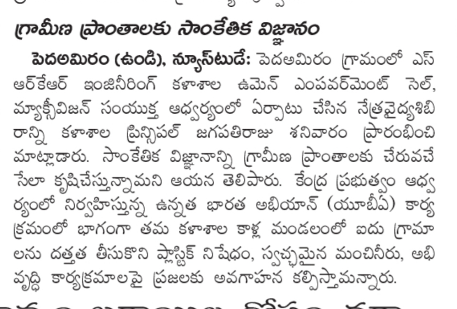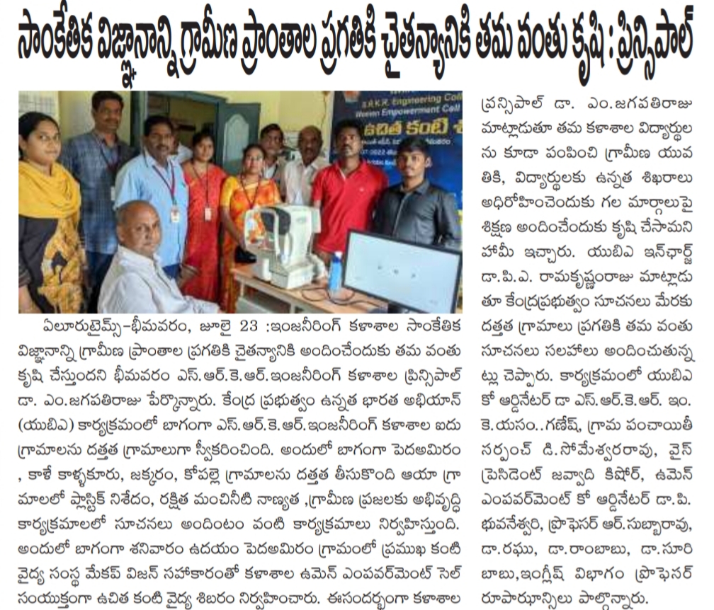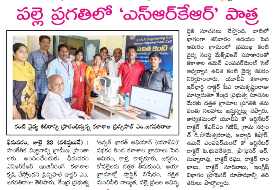SRKR Engineering College Women Empowerment Cell in collaboration with Maxivision had conducted a general Eye Medical Camp at Pedda Amiram village. This camp was inaugurated by the Principal of SRKR, Dr. M. Jagapathi Raju. Speaking on this occasion he said that Technological advancements should be made available to the rural areas too. Unnat Bharat Abhiyan, the flagship programme of central Govt is being followed diligently at SRKR and as a part of this the college had adopted five villages in Kalla Mandal and is creating awareness on Ban of Plastic Items, Providing clean drinking water and many developmental aspects. Nearly 200 patients attended this camp and they were provided with free medicines.