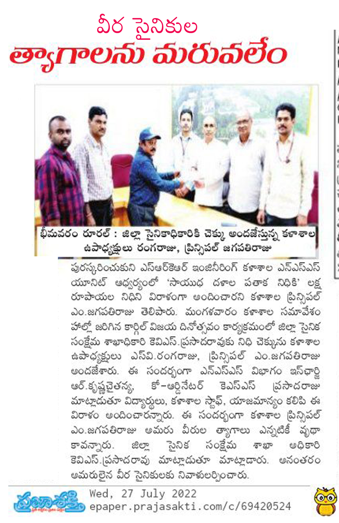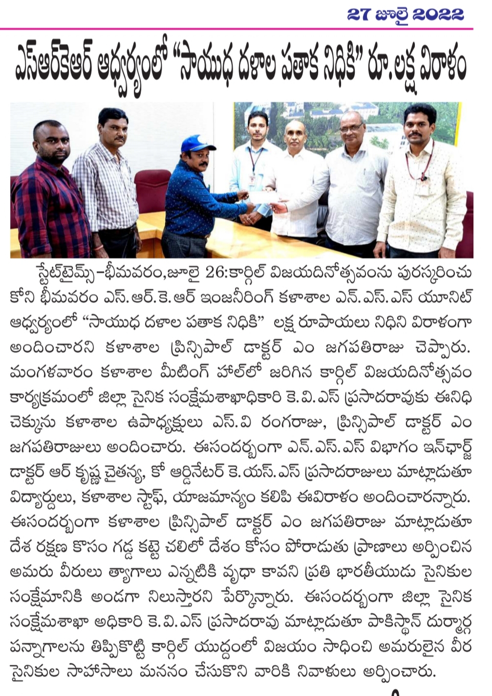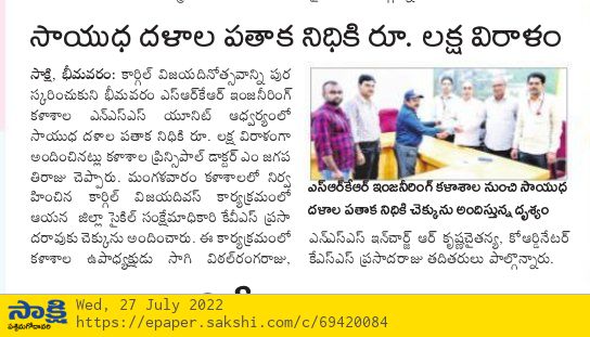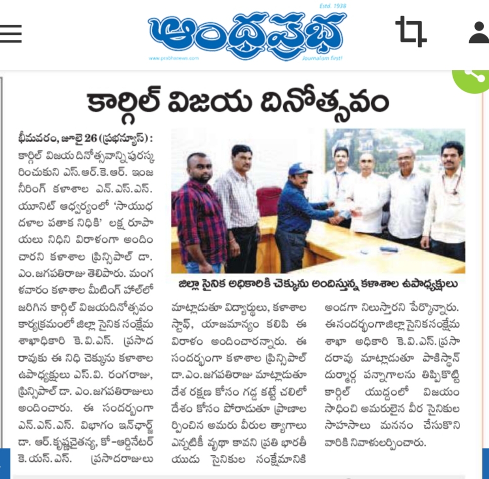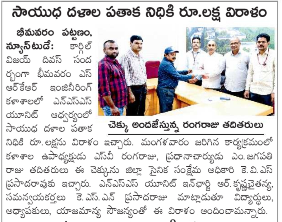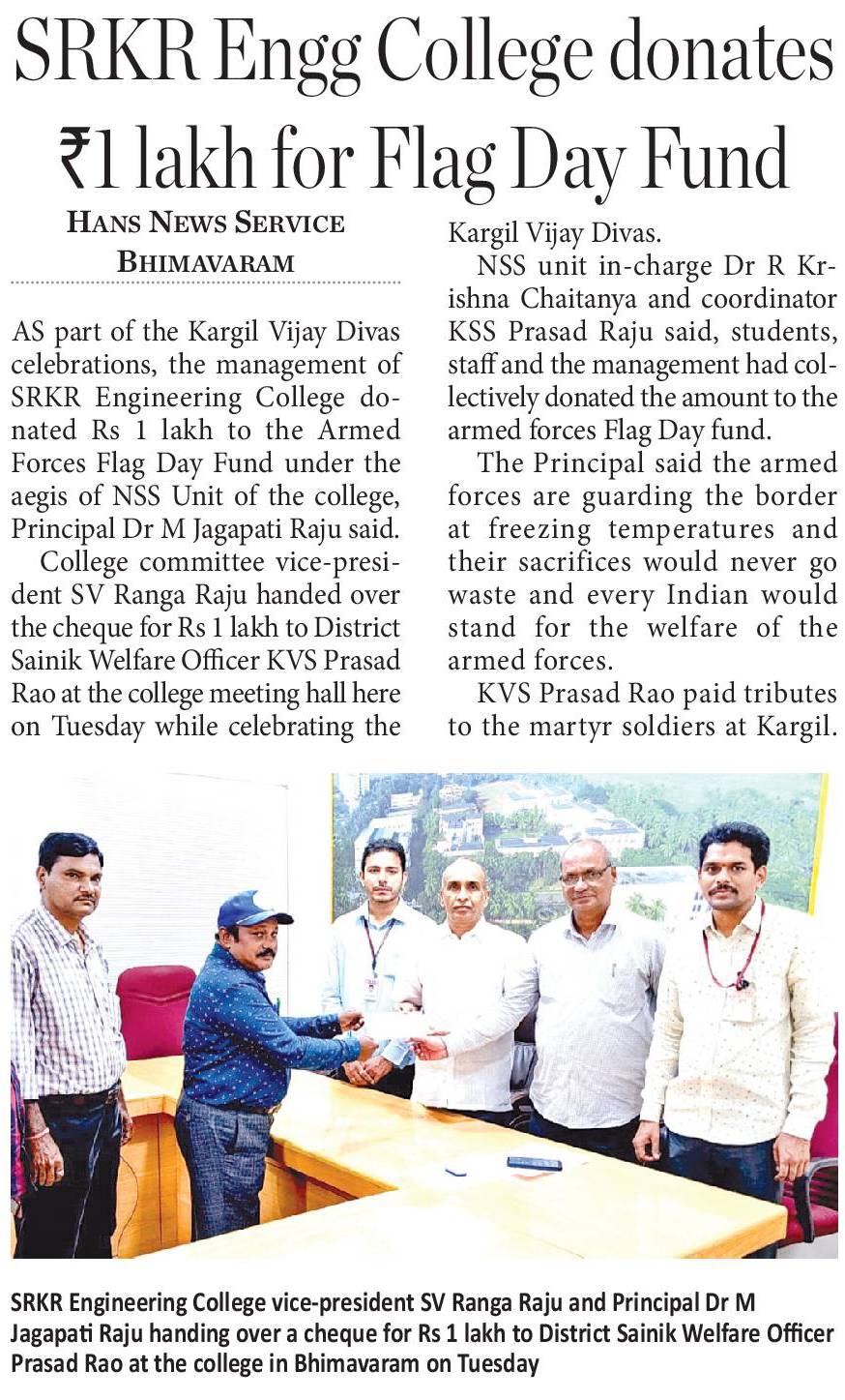 SRKR Engg College had celebrated 'Kargil Vijay Diwas' in a grand manner and donated Rs. 1L to the 'Armed Forces Flag Day Fund'. The cheque was handed over to the District Sainik Welfare Officer Sri. Prasad Rao by the Vice President of SRKR Sri. SV Rangaraju and Principal Dr. M. Jagapathi Raju. NSS In charge Dr. Krishna Chaitanya and Co-Ordinator Mr. Prasada Raju had said that the college faculty and the students donated this amount to the sainik welfare. Speaking on this occasion Principal of SRKR Dr.M.Jagapathi Raju had said that it is the duty of everyone to support the armed forces who are fighting bravely for the country. Everyone paid homage to the martyred soldiers.