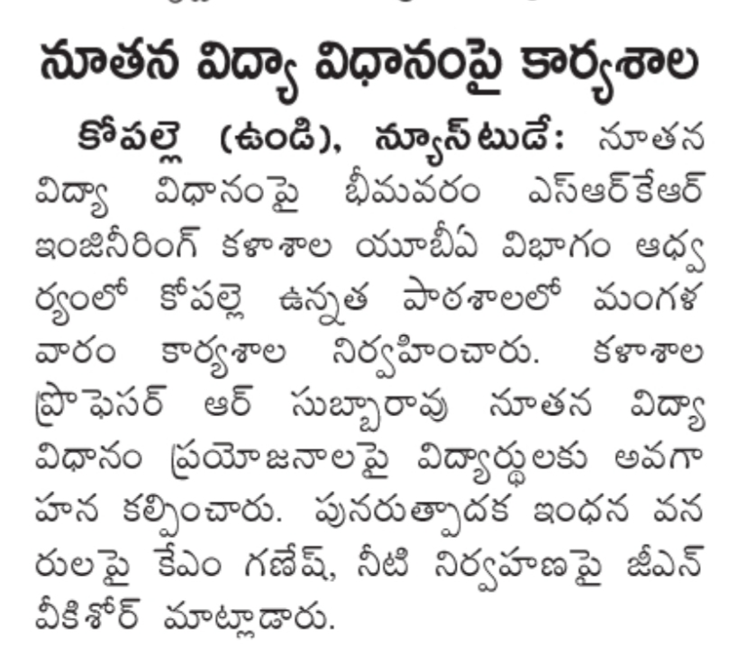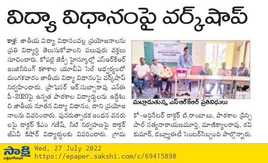SRKR Engg College UBA Cell had conducted an workshop on 'National Educational Policy' at ZP High School, Kopalle. Prof. R. Subbarao had enlightened the students on NEP and its importance. Dr. Ganesh enlightened on the topic of 'Non-Renewable Energy Sources' and Dr. Kishore enlightened on the topic of 'Water Resources'. Village Coordinator Dr. Rambabu, Principal of Kopalle ZP High School Mr. Satyanarayana Murthy, Faculty Mr. Manikyala Rao, Mr. Ravikumar and members of SRKR WET Center participated in this event.