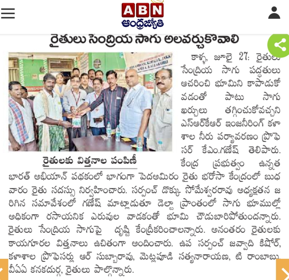 SRKR Engg College under UBA conducted farmers meet at 'Raithu Bharosa Kendram', Peda Amiram village. Speaking on this occasion Prof. Ganesh enlightened the farmers on the concept of 'Organic Farming' so that they can reduce their investment and increase their productivity. He said that the land will lose its fertility because of more fertilizer using. The farmers were distributed with free seeds. Vice President of the village Mr. Kishore, Faculty Dr. Subbarao, Mr. Satyanarayana, Mr. Rambabu participated in this event.