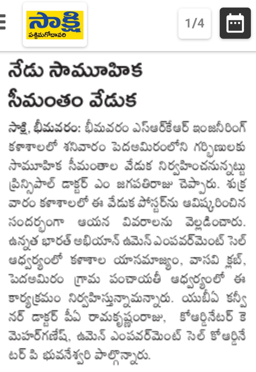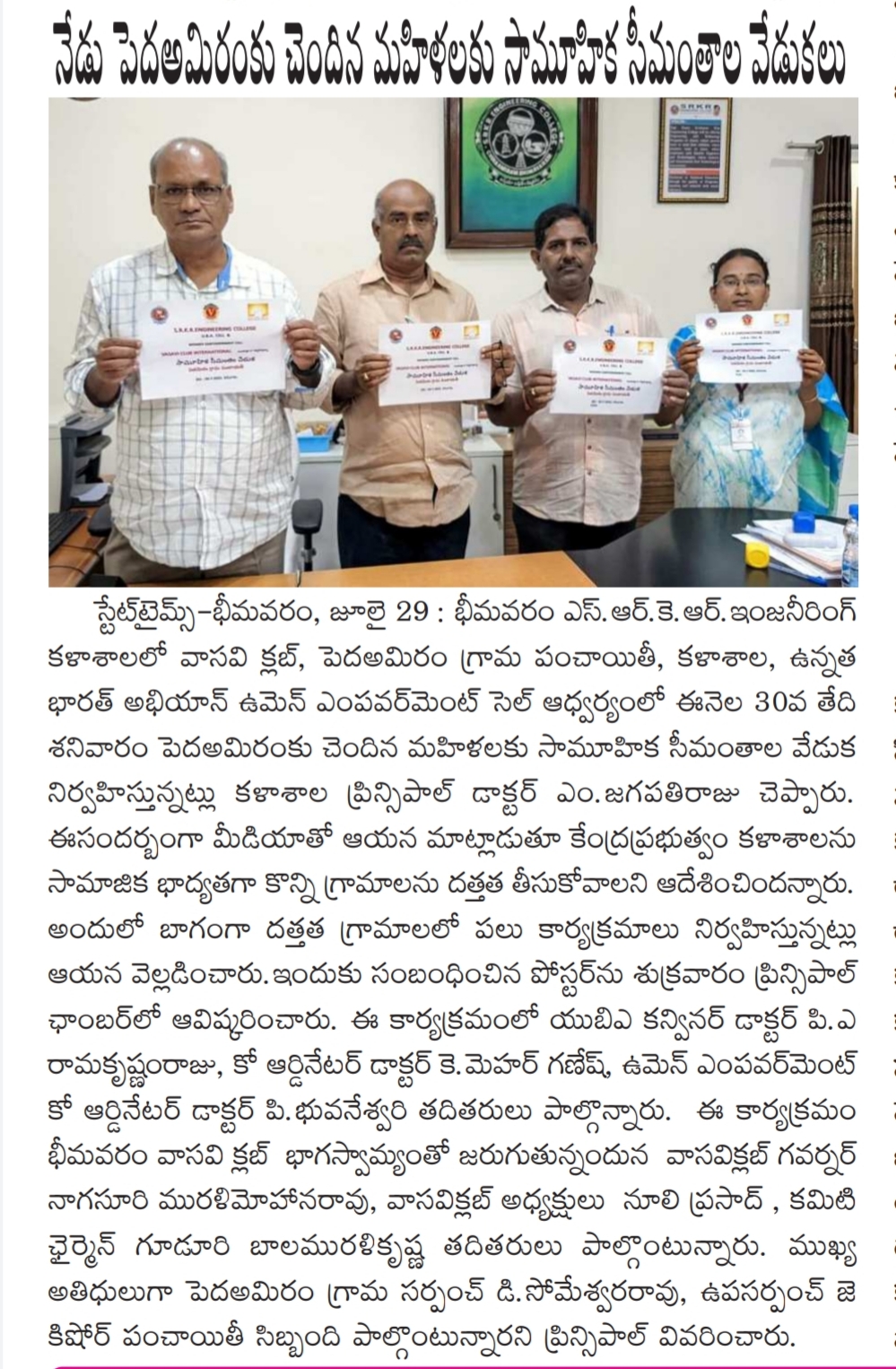 SRKR College under UBA scheme is going to conduct an awareness camp for the pregnant ladies of the Peda Amiram village. This camp will be attended by the President and Vice-President of the village. This programme was being conducted in collaboration with UBA Women Empowerment Cell, Vasavi Club and Village Panchayat of Peda Amiram. Principal of SRKR Dr. M. Jagapathi Raju, UBA Convener Dr. Ramakrishnam Raju, Women Empowerment Cell Coordinator Dr. Bhuvaneshwari participated in this poster release event.