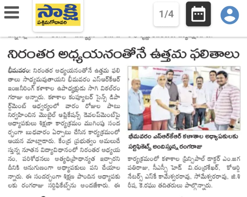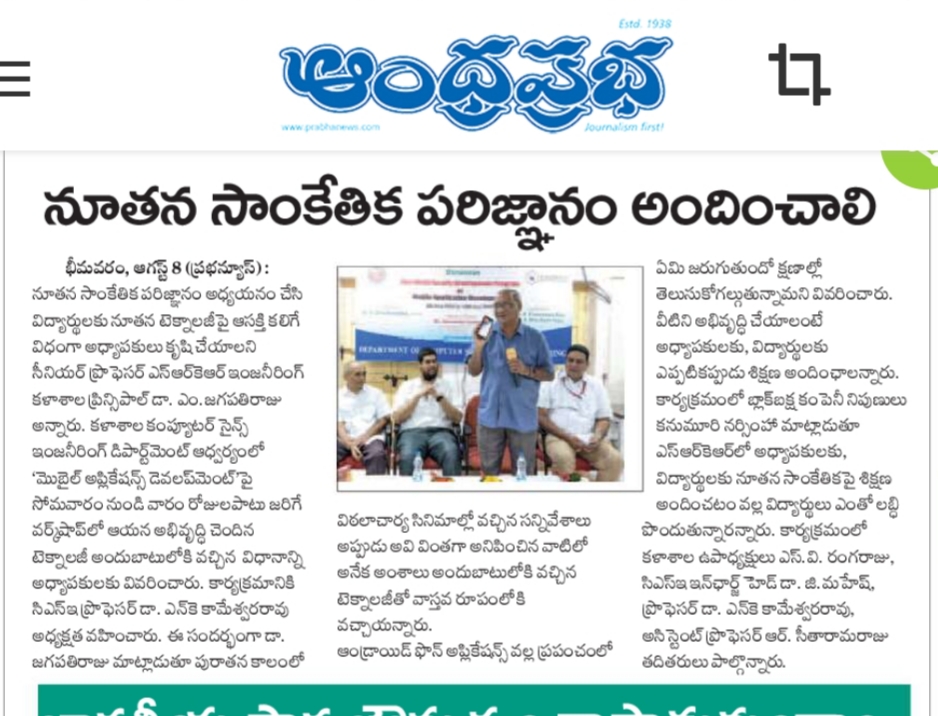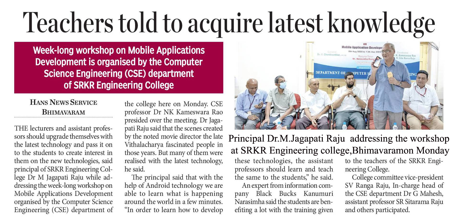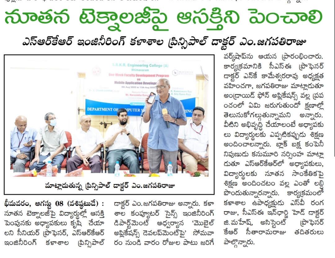 The Department of CSE at SRKR Engineering College is going to conduct a FDP on 'Mobile Applications' from 8th to 13th of August, 2022. Speaking on this occasion Principal of SRKR, Dr. Jagapathi Raju had said that faculty should have experience on latest technologies and they should create interest in students to pursue them further. It is because of Android applications that we are getting to know the latest happenings in the world in a few minutes and it is the duty of the faculty to develop further interesting applications and ignite the students. Blackbuck company expert Mr. Narsimha Kanumuri said the faculty and students of SRKR will be benefitted by learning the latest technologies. Vice President of SRKR Sri. SV Ranga Raju, CSE In Charge HOD Dr. Mahesh, Prof. Dr. Kameshwara Rao, Assistant Professor Mr. R. Seetharama Raju took part in this occasion.