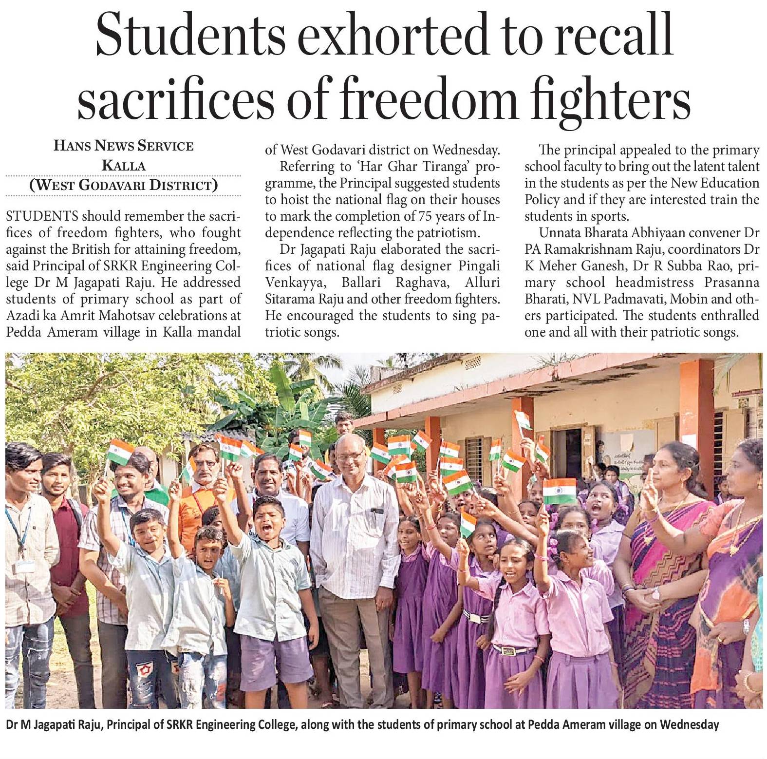 SRKR Engineering College had conducted 'Azaadi Ka Amrit Mahotsav' at Primary school of Peda Amiram village under UBA Scheme. Speaking on this occasion, Principal of SRKR Dr. M. Jagapathi Raju had said that as we are celebrating 75 years of Indian Independence, everyone should hoist and respect the national flag at their homes and other public places. UBA Coordinator Dr. Ramakrishnam Raju, Faculty Mr. Meher Ganesh, Mr. Subbarao and Head Mistress of School Ms. Padmavathi participated in this event.