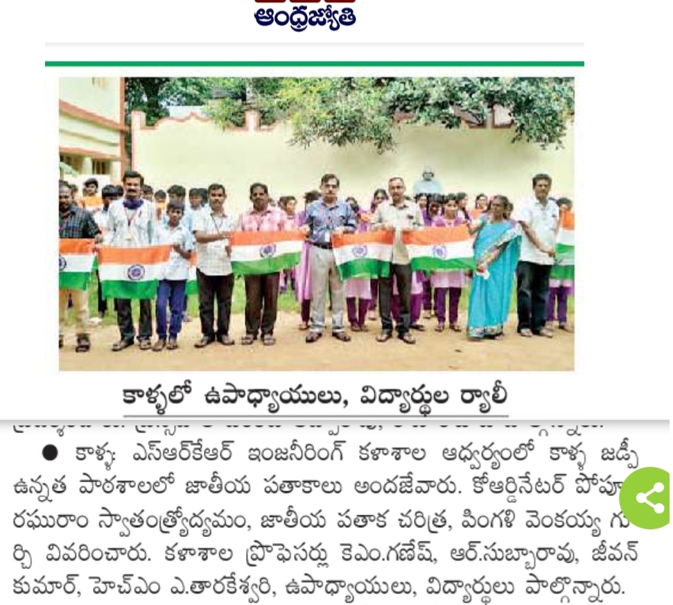SRKR Engineering College under the UBA Scheme had distributed National Flags to the students of Kalla ZP High School. Coordinator Mr. Raghuram had explained to the students about the freedom struggle, national flag and the inspiring story of Mr. Pingali Venkayya. Faculty of SRKR Mr. Ganesh, Dr. Subbarao, Mr. Jeevan Kumar, Head Mistress of ZP High School, Kalla Ms. Tarakeswari were present in this occasion.