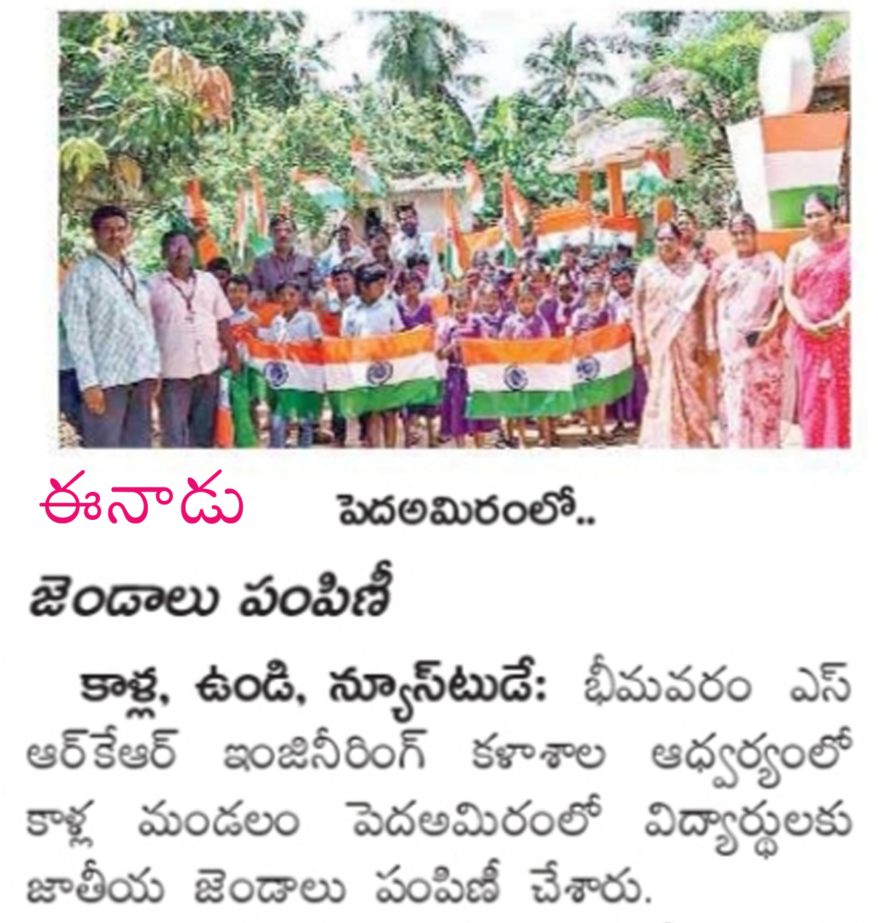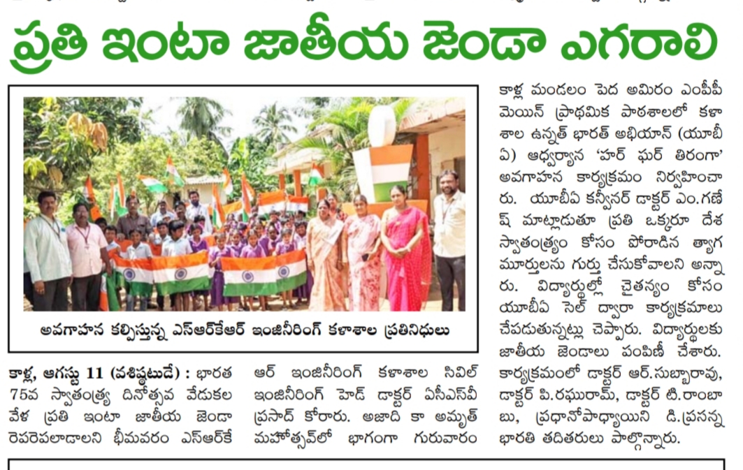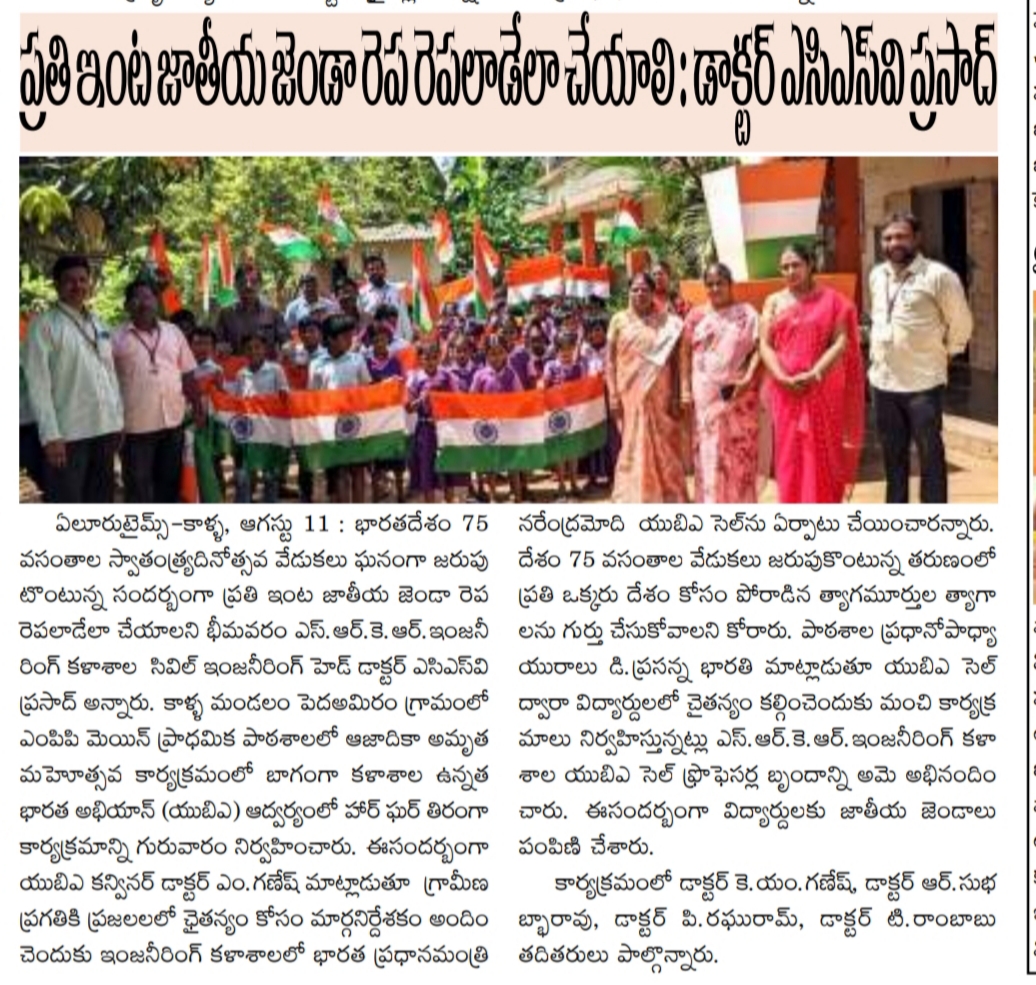 SRKR Engineering College under 'UBA' scheme had distributed National Flag's at the Pedda Amiram High School on the occasion of 'Azaadi Ka Amrit Mahotsav'. UBA Convener Dr. Ganesh, Civil HOD Dr. Prasad, Head Mistress Smt. Prasanna Bharathi took part in this event. Students were asked to remember the sacrifices of the freedom fighters and keep up the spirit of Mother India.