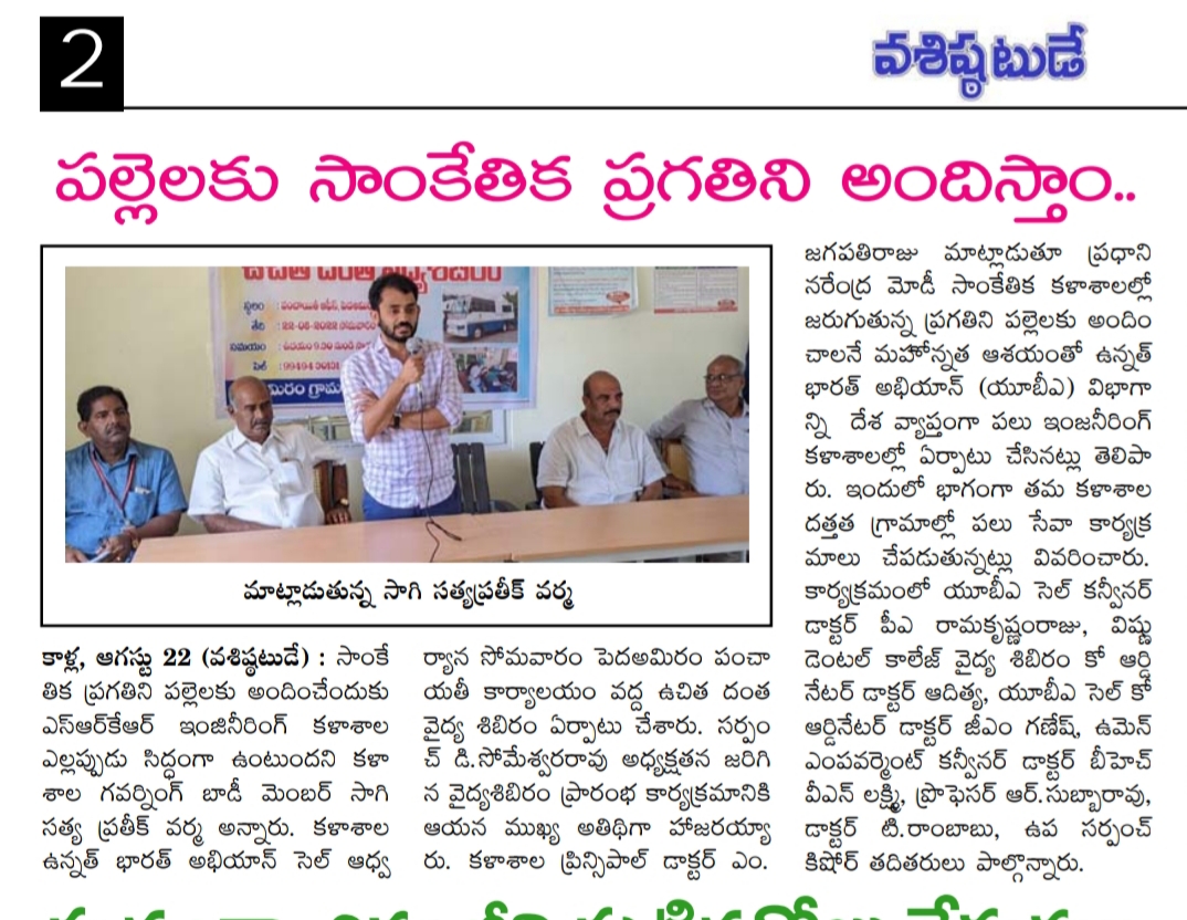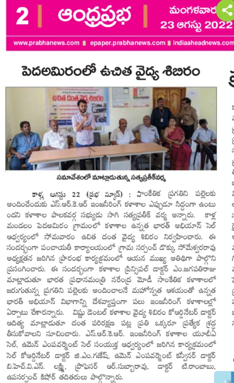SRKR Engineering College in collaboration with Women Empowerment Cell and Vishnu Dental College had conducted Free Dental Camp at Pedda Amiram Village under the 'Unnat Bharat Abhiyan' scheme. Speaking on this occasion SRKR Governing Council Member Mr. Pratik Varma had said that SRKR is committed to serve the rural areas with the latest technologies and developments and dedicated to uplift them. Principal of SRKR, Dr. M. Jagapathi Raju had said that as per the directions of PM Modi under 'UBA' scheme, SRKR is dedicating itself to the upliftment of the rural areas. UBA Cell Convener Dr. Ramakrishnam Raju, UBA Cell Coordinator Dr. Ganesh, Women Empowerment Cell Convener Dr. Lakshmi, President and Vice-President Pedda Amiram Panchayat took part in this noble event.