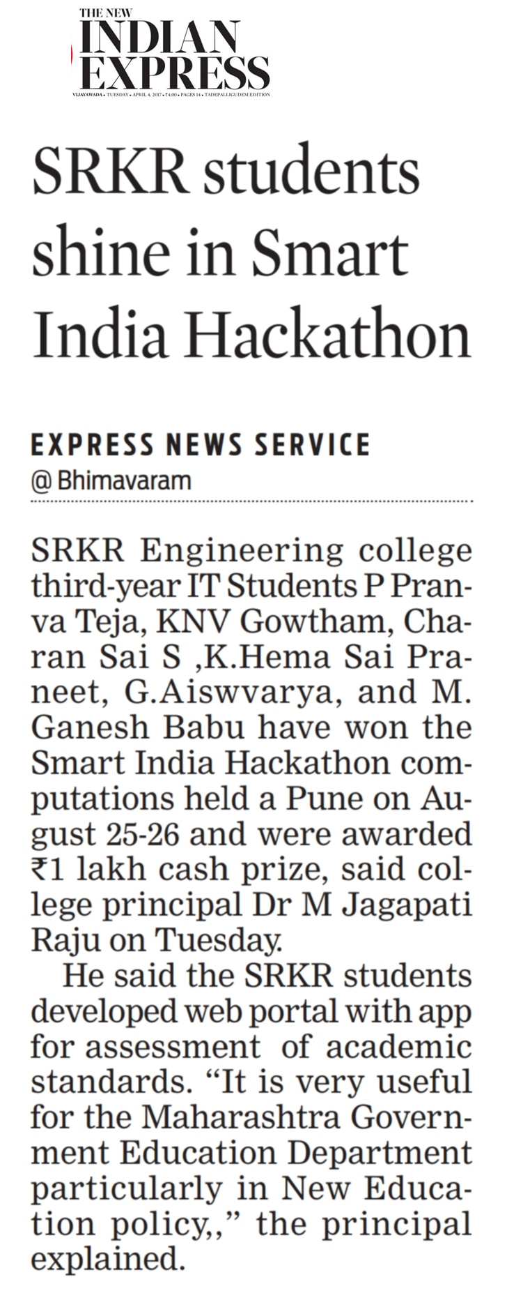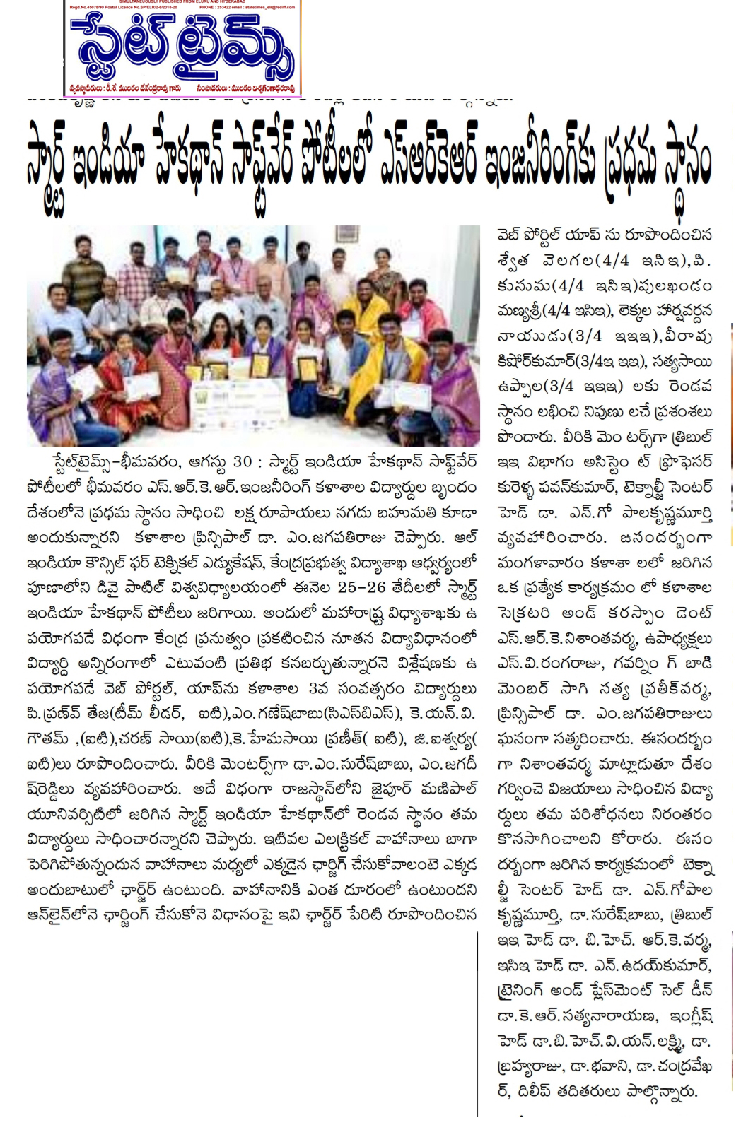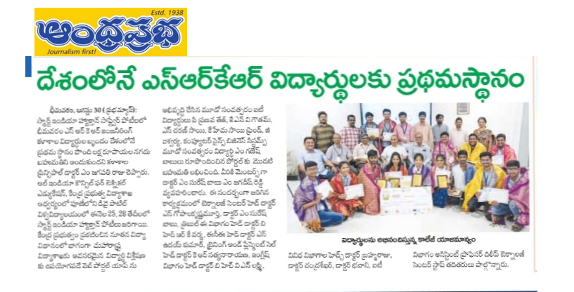 SRKR Engineering College had emerged as the winner in the National Level 'Smart India Hackathon' and received a cash prize of Rs. 1,00,000. This hackathon was conducted under the aegis of AICTE and HRD Ministry at Pune. College students M. Ganesh Babu, P. Pranav Tej, KNV Goutham, Charan Sai, K. Hema Sai Praneeth and G. Aiswarya had developed a web portal and brought accolades to the institution. College students V. Swetha, P Kusuma, P. Manya Sree, Harshavardhan Nayudu, Kishore Kumar, U. Satya Sai had developed a web portal to solve the problems that arises while charging the electric vehicles and stood second at the hackathon conducted at Manipal University, Jaipur.