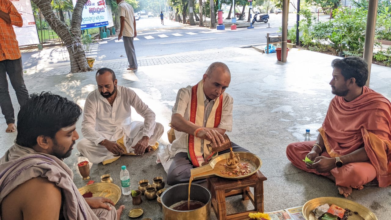 Lakshmi Ganapati Homam was being performed at the college premises on the occasion of 'Vinayaka Chavithi Celebrations'. SRKR Vice President Sri. SV Ranga Raju and Principal of SRKR Dr. M. Jagapathi Raju along with the large number of staff and students took part in this event. Speaking on this occasion Vice-President and Principal had said that the college will raise to new heights with the divine blessings of the almighty and co-operation of the staff and splendid performance by the students.