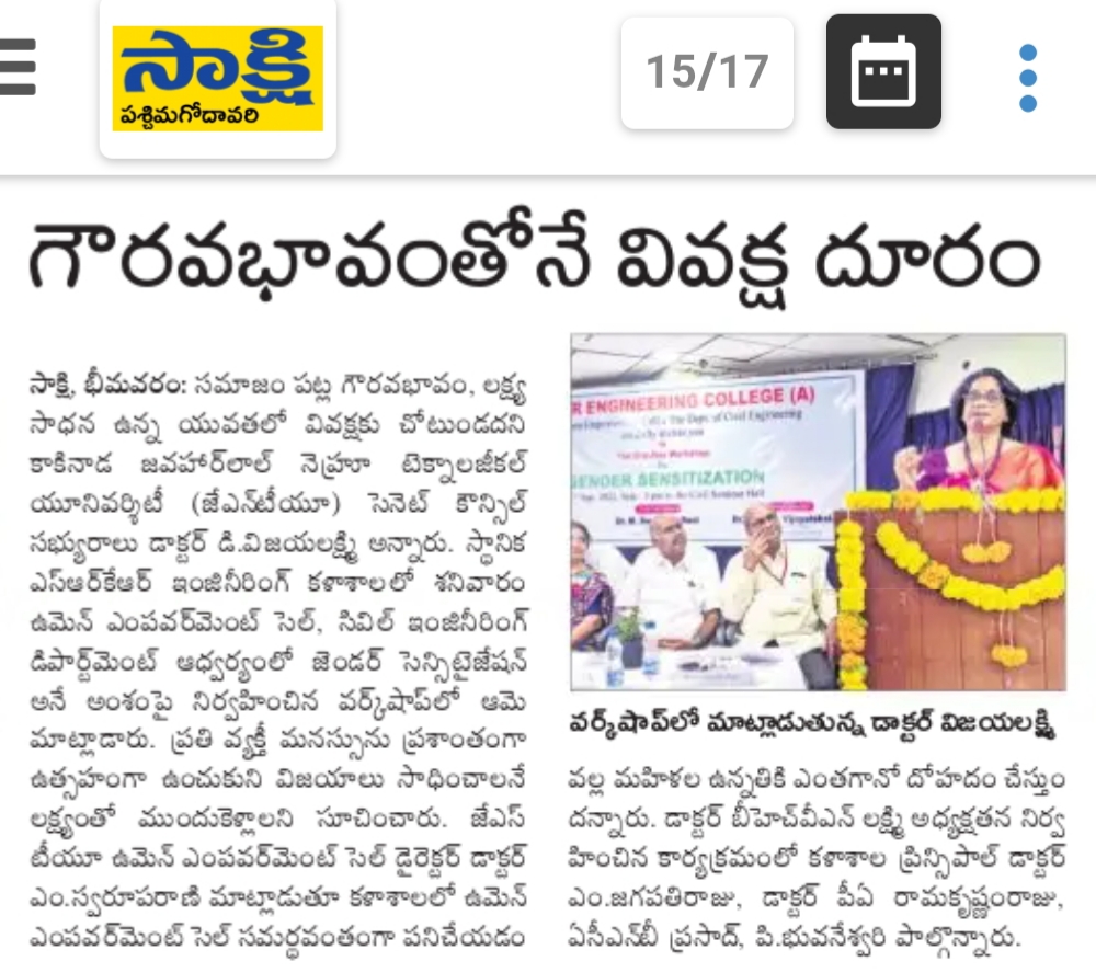 Women Empowerment Cell in Collaboration with Civil Department had conducted a workshop on 'Gender Sensitization'. JNTU Senate Council Member Dr. D. Vijayalakshmi has attended this workshop as a chief guest and she said that there will not be discrimination in youth when they are completely involved in chasing their goals and respect towards the society. Everyone should be mentally strong and march ahead in reaching their goals. JNTU Women Empowerment Cell Director Dr. Swaroopa Rani said that it is very happy to see the women empowerment Cell performing exceptionally well at SRKR. Dr. BHVN Lakshmi had presided over this workshop and Principal of SRKR, Dr. M. Jagapathi Raju, Dr. P. Ramakrishnam Raju, Dr. Prasad and Dr. Bhuvaneshwari took part in this workshop.