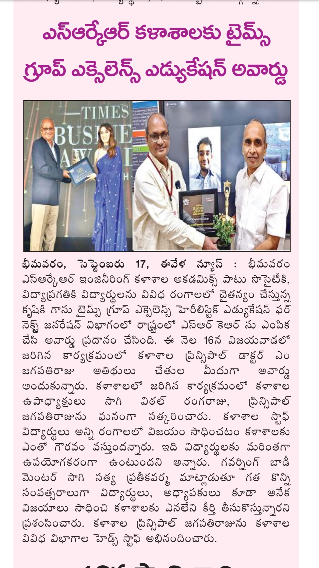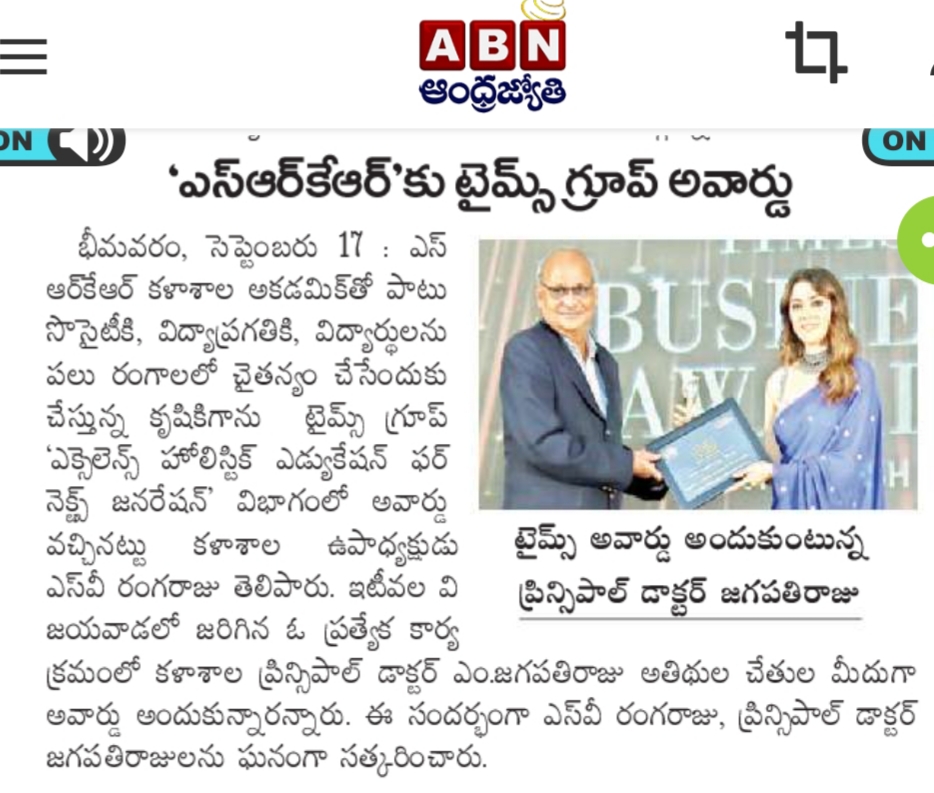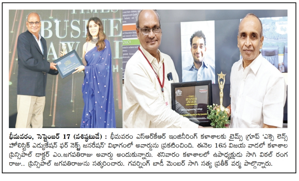 SRKR Engineering College had received ˜Times Group Awards-2022’ in the field of 'Excellence in Holistic Education for Next Generation'. Speaking on this achievement SRKR Vice President Sri. SV Ranga Raju had said that this proud achievement had been bestowed on SRKR for its exemplary contribution in the areas of Societal Development, Educational Excellence and Empowering the students in various sectors. This award had been received by the Principal of SRKR, Dr. M. Jagapathi Raju at Vijayawada on behalf of the institution. The management of the college had felicitated the Principal on this occasion.
