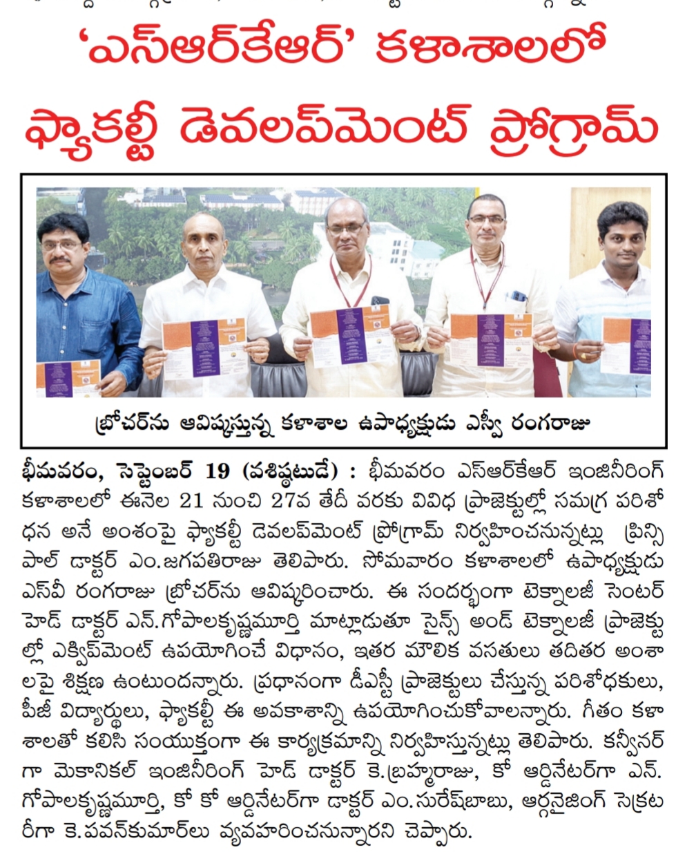 SRKR Engineering College is conducting a FDP on 'Integrative Research in Various Fields of Engineering' from 21st to 27th of Sept, 2022 in association with GITAMS University, Principal of SRKR Dr. M. Jagapathi Raju had said. The brochure relating to the same was inaugurated by SRKR Vice President Mr. SV Ranga Raju. Speaking on this occasion, Technology Centre Head Dr. Gopalakrishna Murthy had said that this FDP would concentrate on various techniques and methods used in projects relating to DST and other funded agencies. HOD of Mechanical Dept, Dr. Brahma Raju would act as Convener, Dr. Gopalakrishna Murthy would be the Coordinator, Dr. Suresh Babu would be the Co-Coordinator and Mr. Pavan Kumar would be the Organizing Secretary for this FDP.