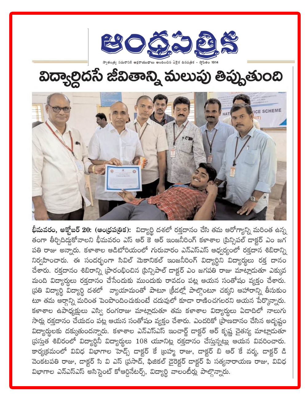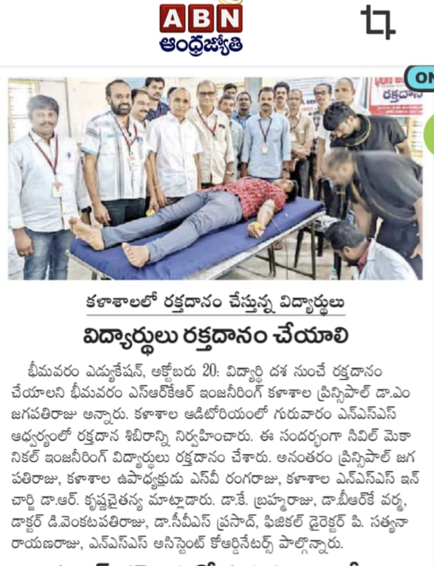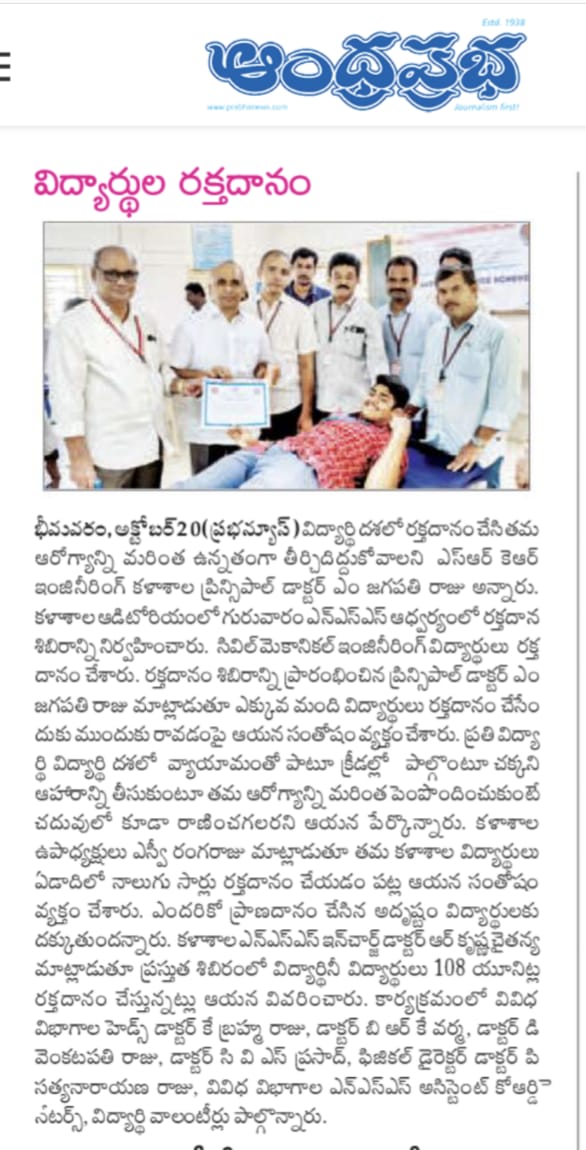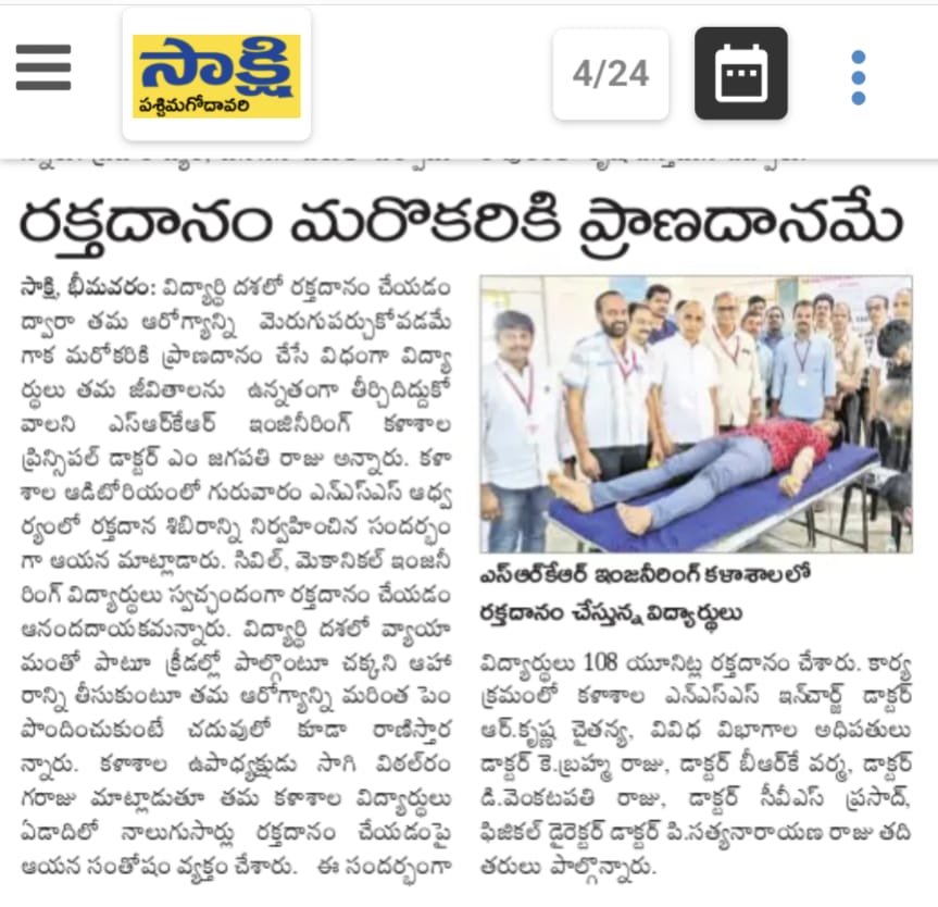 The NSS Unit at SRKR Engg College had conducted a Blood Donation Camp where the Civil and Mechanical Engineering Students had donated the blood for a noble cause. Principal of SRKR, Dr. M. Jagapathi Raju had said that students should inculcate the habit of donating the blood right from the childhood. Vice President of SRKR, Mr. SV Ranga Raju, College NSS Coordinator Dr. Krishna Chaitanya, HOD’s Dr. Brahma Raju, Dr. Varma, Dr. Venkatapathi Raju, Dr. Prasad, Physical Education Department staff etc. took part in this programme.