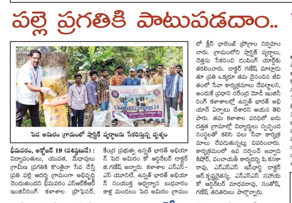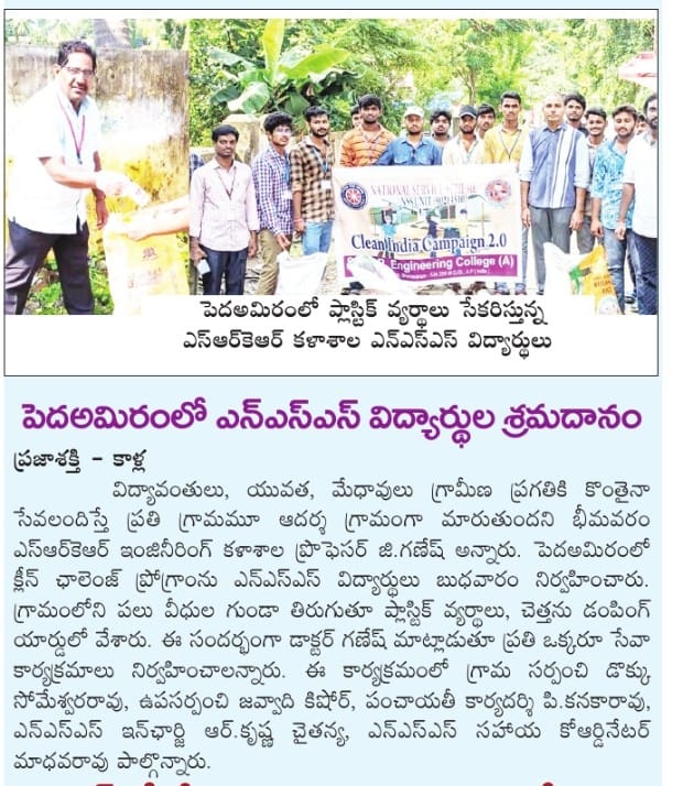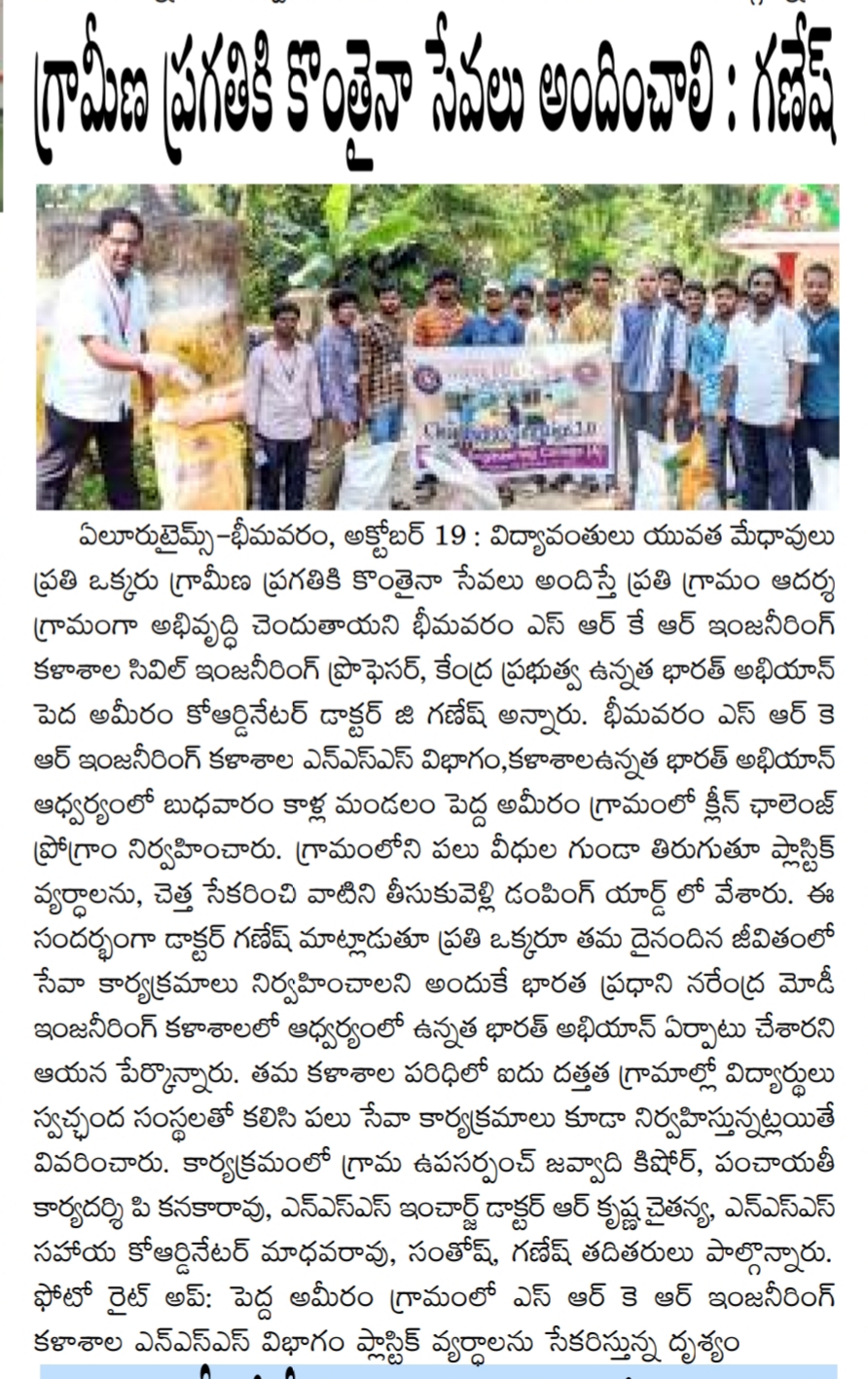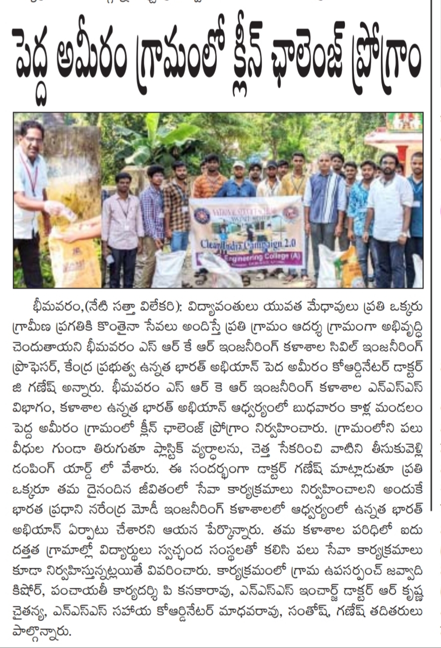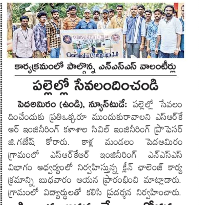 The students of SRKR Engg College had conducted an Clean Challenge drive at Pedamiram Village under the college NSS Unit. Speaking on this occasion, Professor of Civil Engg Dr. Ganesh had said that students should voluntarily come forward to serve in the villages. The students took part in an awareness campaign in the village.