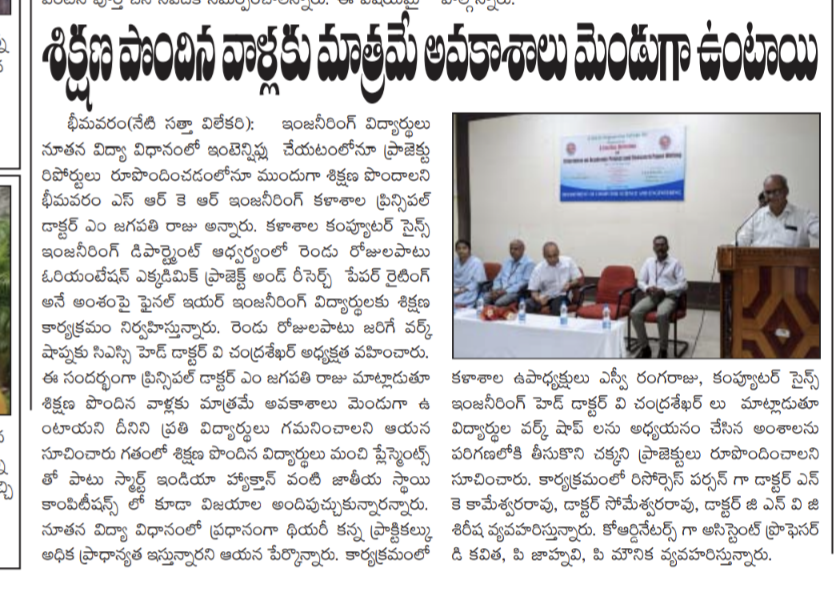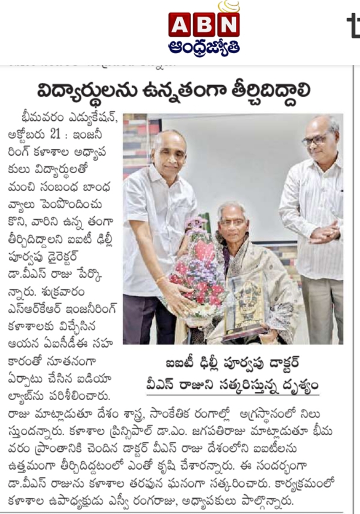 Former Director of IIT Delhi, Dr. VS Raju had visited SRKR and the Idea Lab that was constituted newly in collaboration with AICTE. Speaking on this occasion, he said that the faculty should develop good relation with the students and develop them intellectually. He said that India is slowly emerging as a champion in the fields of science and technology in the entire world. Principal of SRKR, Dr. M. Jagapathi Raju had detailed the contributions of Dr. Raju to the eminent academic institutions across the country. The management of SRKR had felicitated Dr. Raju in a grand manner. Vice President of SRKR Dr. SV Ranga Raju and other faculty took part in this occasion.