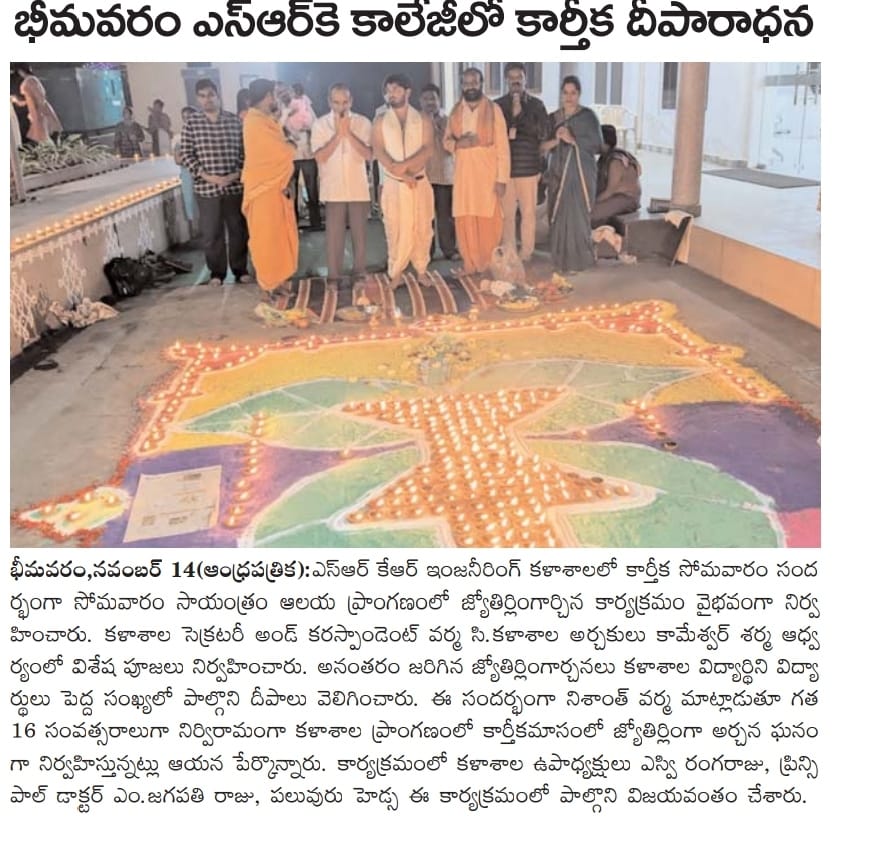 On the eve of 'Karthika Somavaram' the management, staff and students of SRKR Engg College had conducted 'Karthika Deeparadhana' in the college premises in a devotional manner. Secretary and Correspondent of SRKR Engg College, Sri. SRK Nishanth Varma, Vice-President Sri. SV Ranga Raju and Principal Dr. M. Jagapathi Raju along with staff and students had participated in this event in large numbers. Speaking on this occasion Sri. Nishanth Varma had said that it is the tradition at SRKR to celebrate this event from the last 16 years. He wished the staff and students that their lives should be bright and success should fulfill their lives.