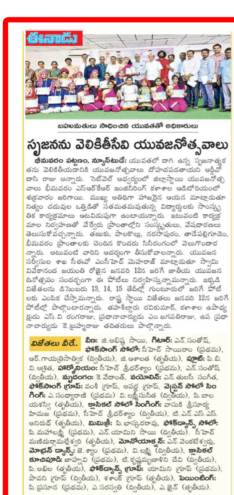 District Level 'Yuvajanotsav' by AP Govt was being held in a gradient manner at SRKR Engg College. Chief Guest of this occasion RDO Sri. Dasi Raju had said that these events play a major role in bringing out the hidden talents of the students. These events act as a stress buster for the students who are busy in their academics. Through these events students can come to know about various cultures and traditions of the country. CEO of Youth Services Mr. Mohan raj had said that the winners in these events will attend the selections at Guntur and the winners there will participate in the National Youth Day Celebrations on January 12th, 2023. Tahsildar Mr. Ravikumar, SRKR Vice President Mr. SV Ranga Raju, Principal Dr. Jagapathi Raju, Vice-Principal Dr. K. Brahma Raju graced this event.