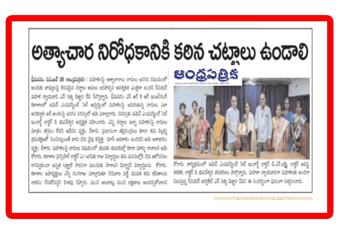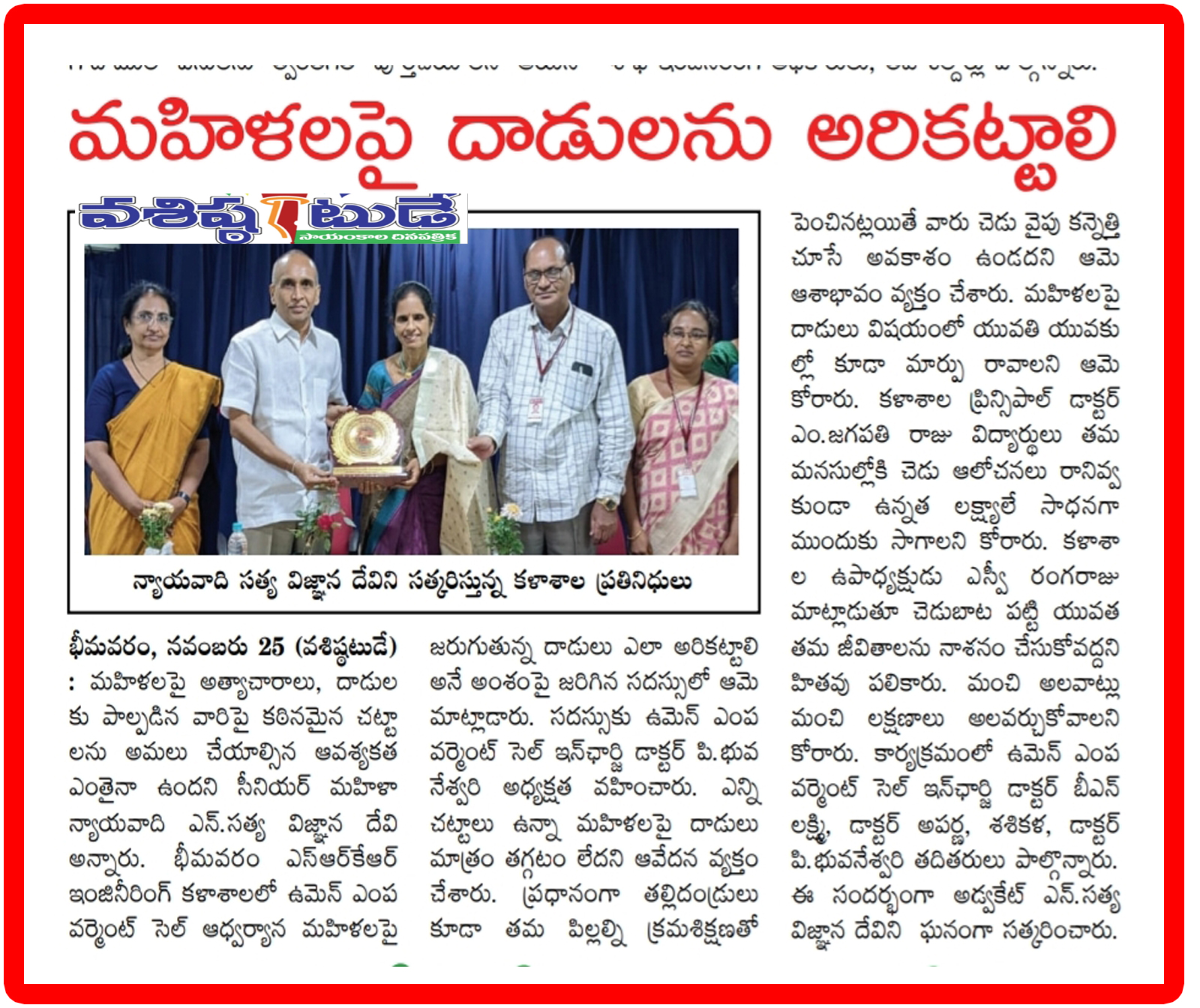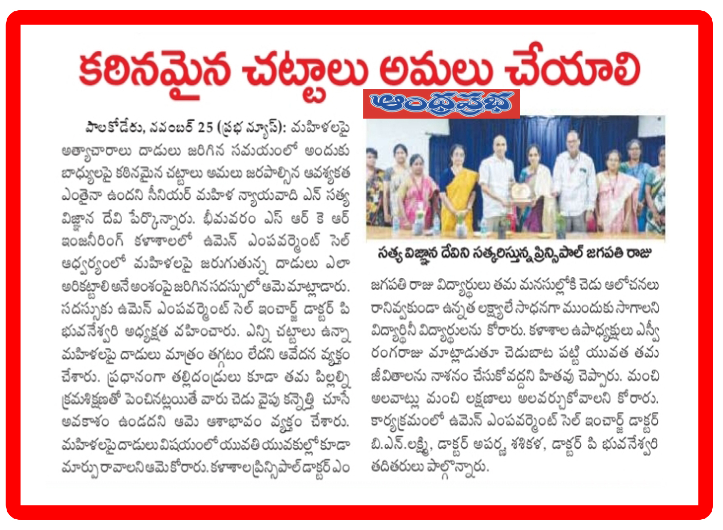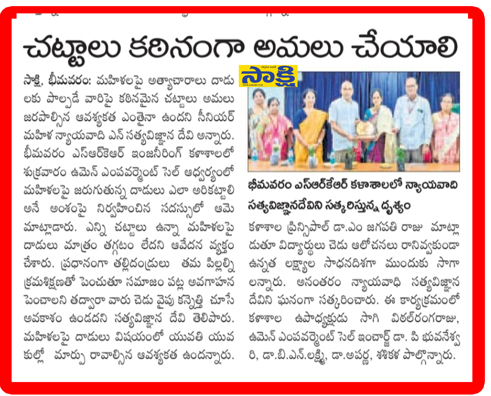 The Women Empowerment Cell at SRKR Engg College had organized a Workshop on the above topic. Speaking on this occasion Telugu Language Moment President G. Sridevi had said that the violence against women is due to non-following of our traditions and culture by the present generation people. SRKR Vice President Sri. SV Ranga Raju, Principal of SRKR Dr. M. Jagapathi Raju, Women Empowerment Cell Coordinator Dr. Bhuvaneshwari, Dr. BHVN Lakshmi, Dr. Hyma Lakshmi, Dr. Aparna took part in this event.