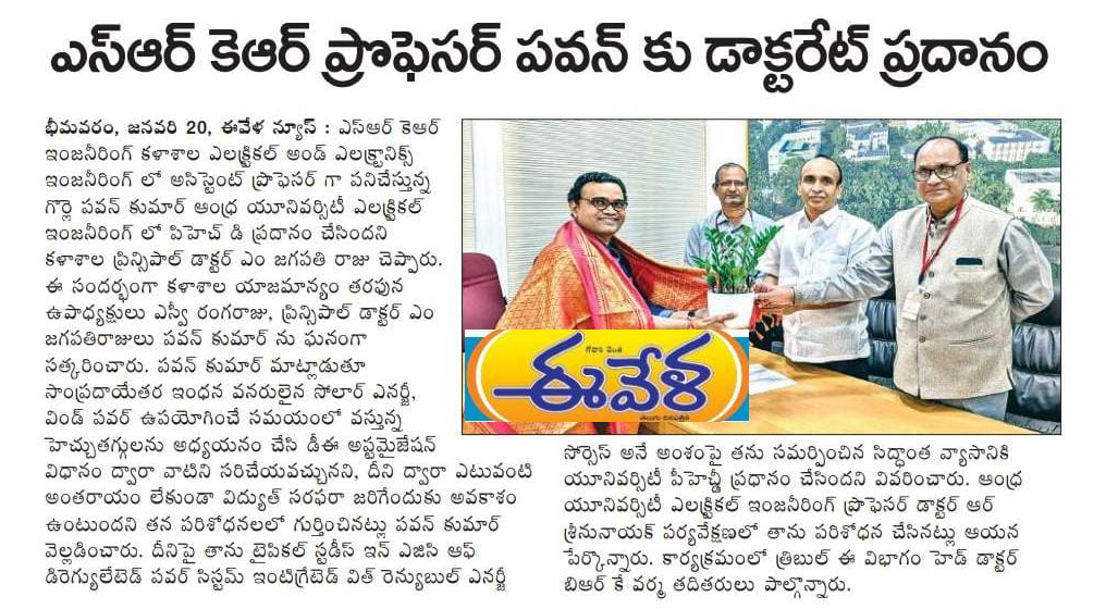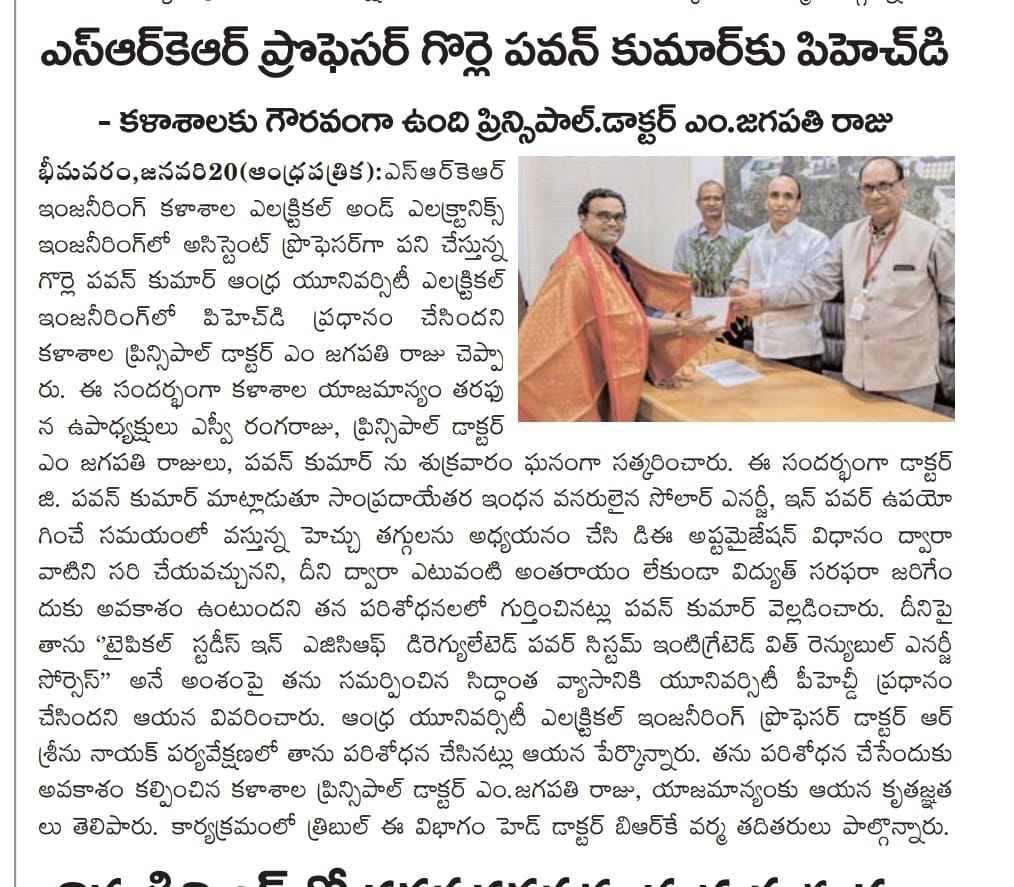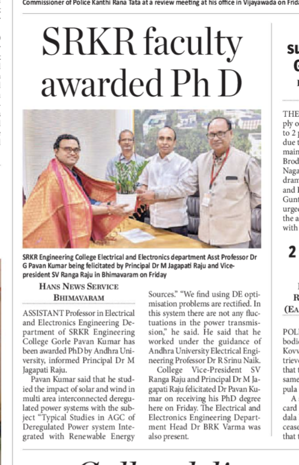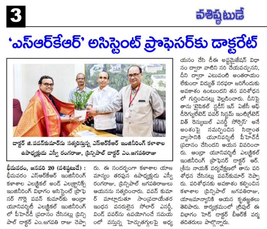 Mr. Gorla Pavan Kumar, Assistant Professor in the Department of EEE had received his PhD from