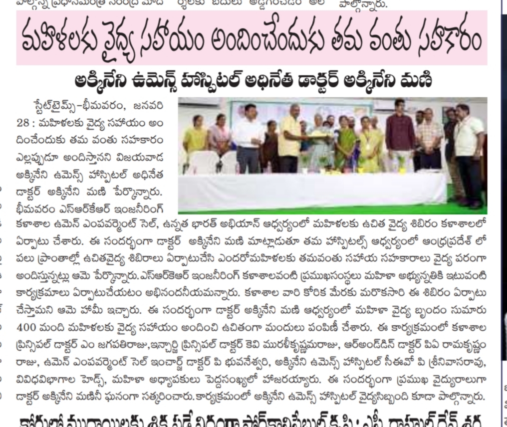 A mega health camp was being organised at SRKR Engg College by Women Empowerment Cell,