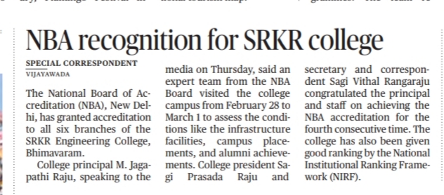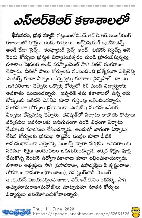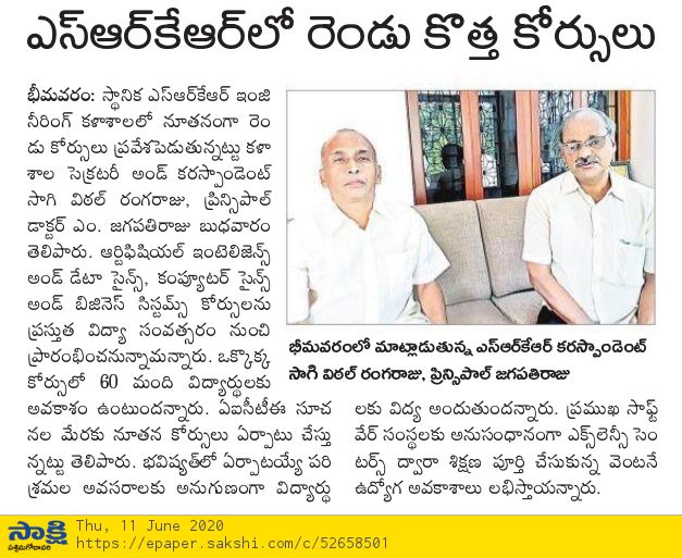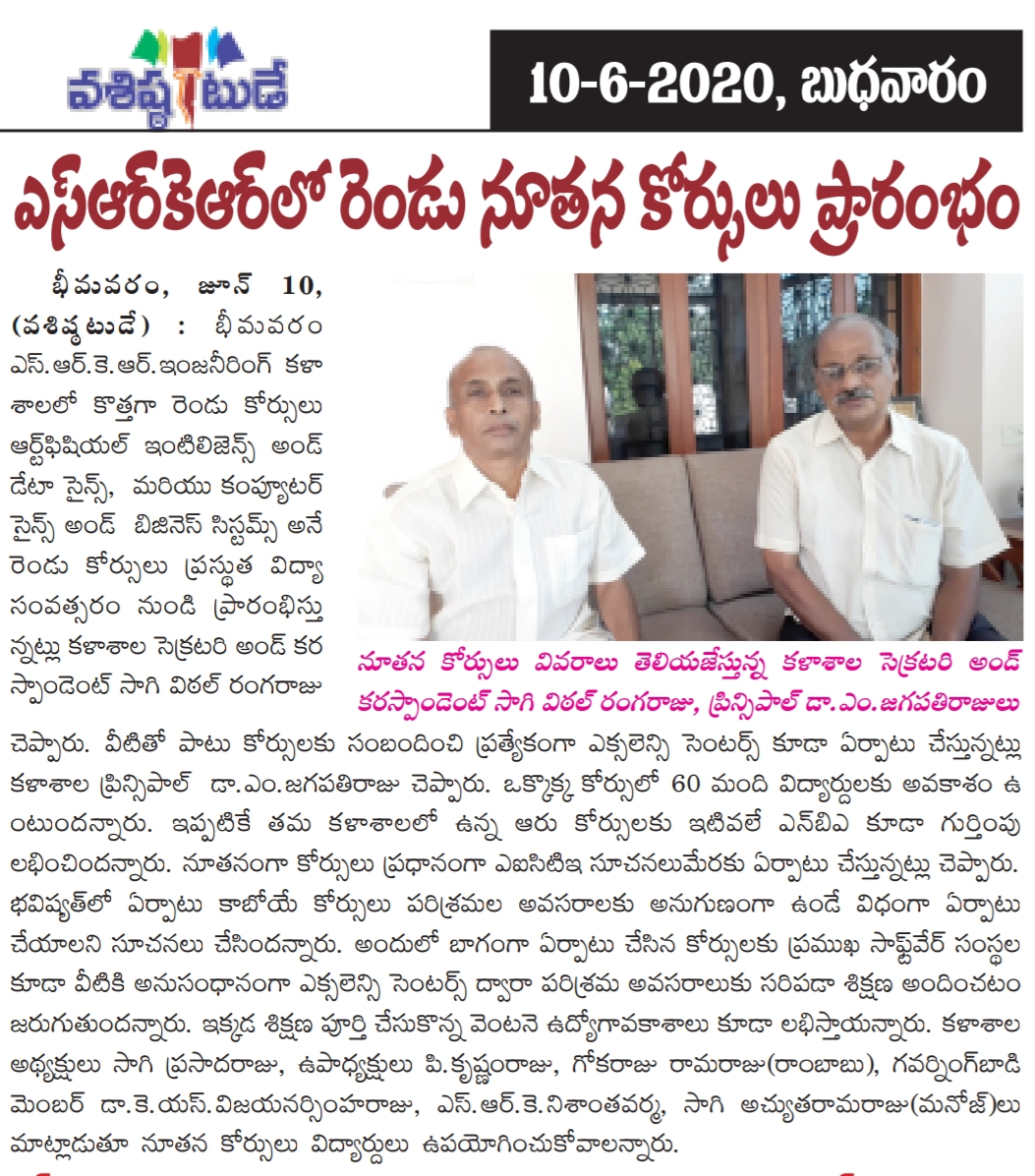 AICTE has sanctioned two new branches in SRKREC from the academic year 2020-21 with an intake of 60 each.