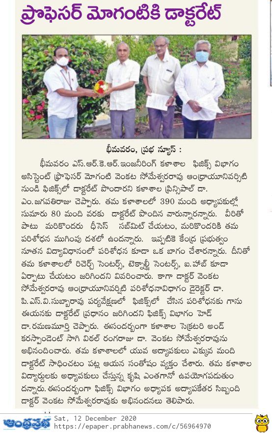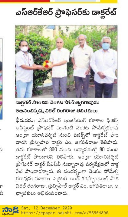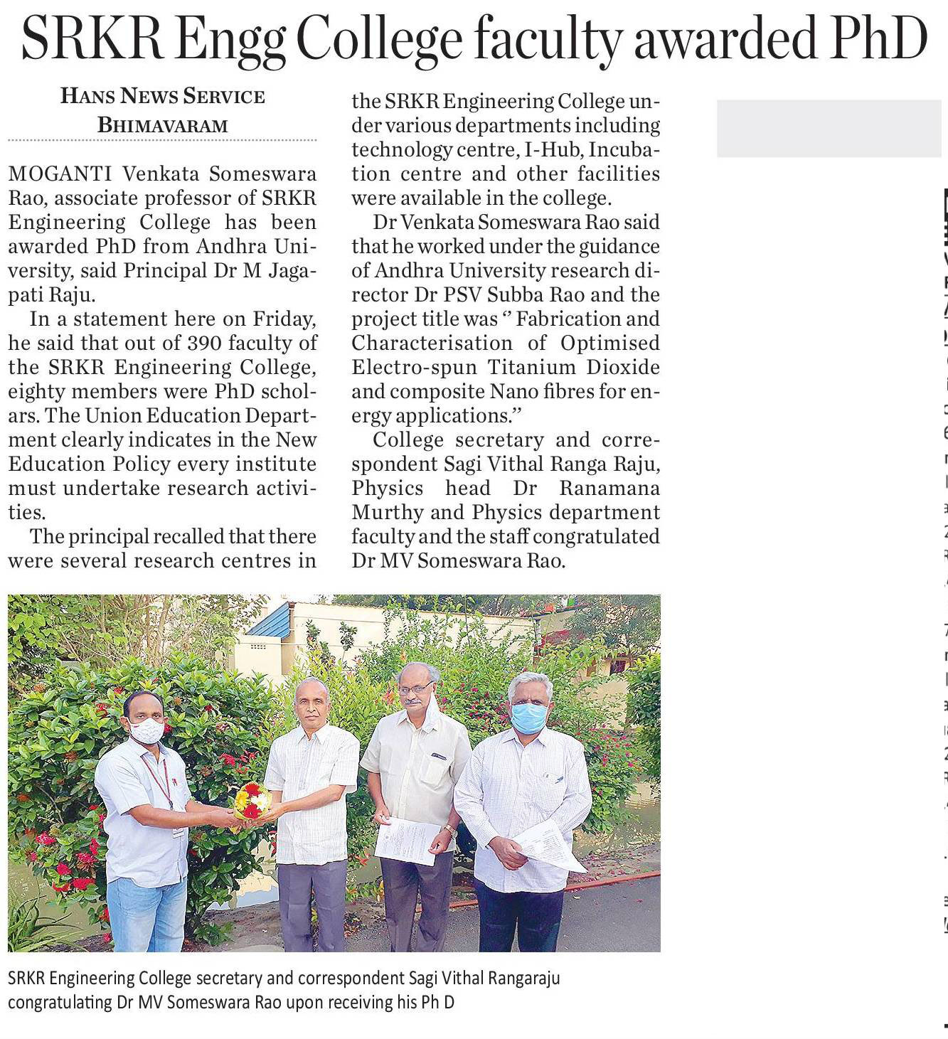Moganti Venkata Someswara Rao, Assistant Professor of Physics Department, SRKREC has been awarded with PhD from Andhra University for his thesis titled "Fabrication and Characterisation of Optimised Electro-spun Titanium Dioxide and Composite Nano Fibres for Energy Applications" under the guideship of Dr. PSV Subba Rao, Research Director, Andhra University.