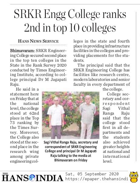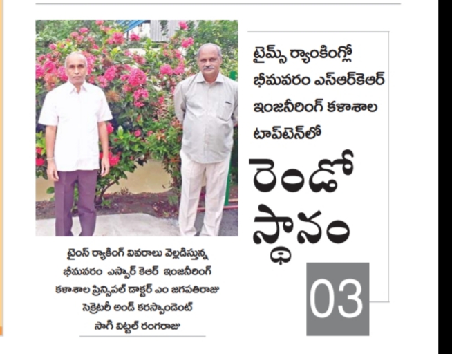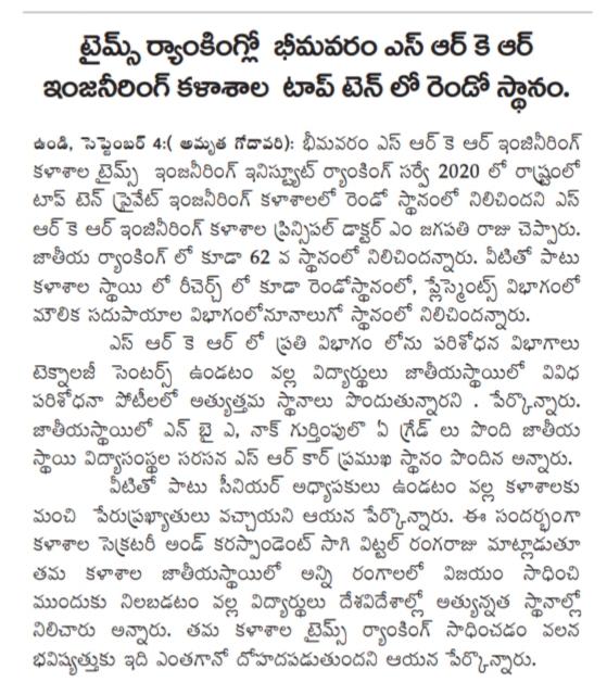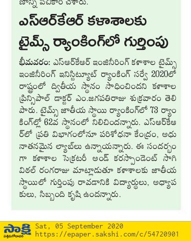 SRKREC secured 2nd place in the top 10 colleges in the state in the ranking survey 2020 conducted by Times Engineering Institute. At national level, the college stood at 62nd place, stood 2nd in the research category in the state and 4th in the state in the infrastructure category.